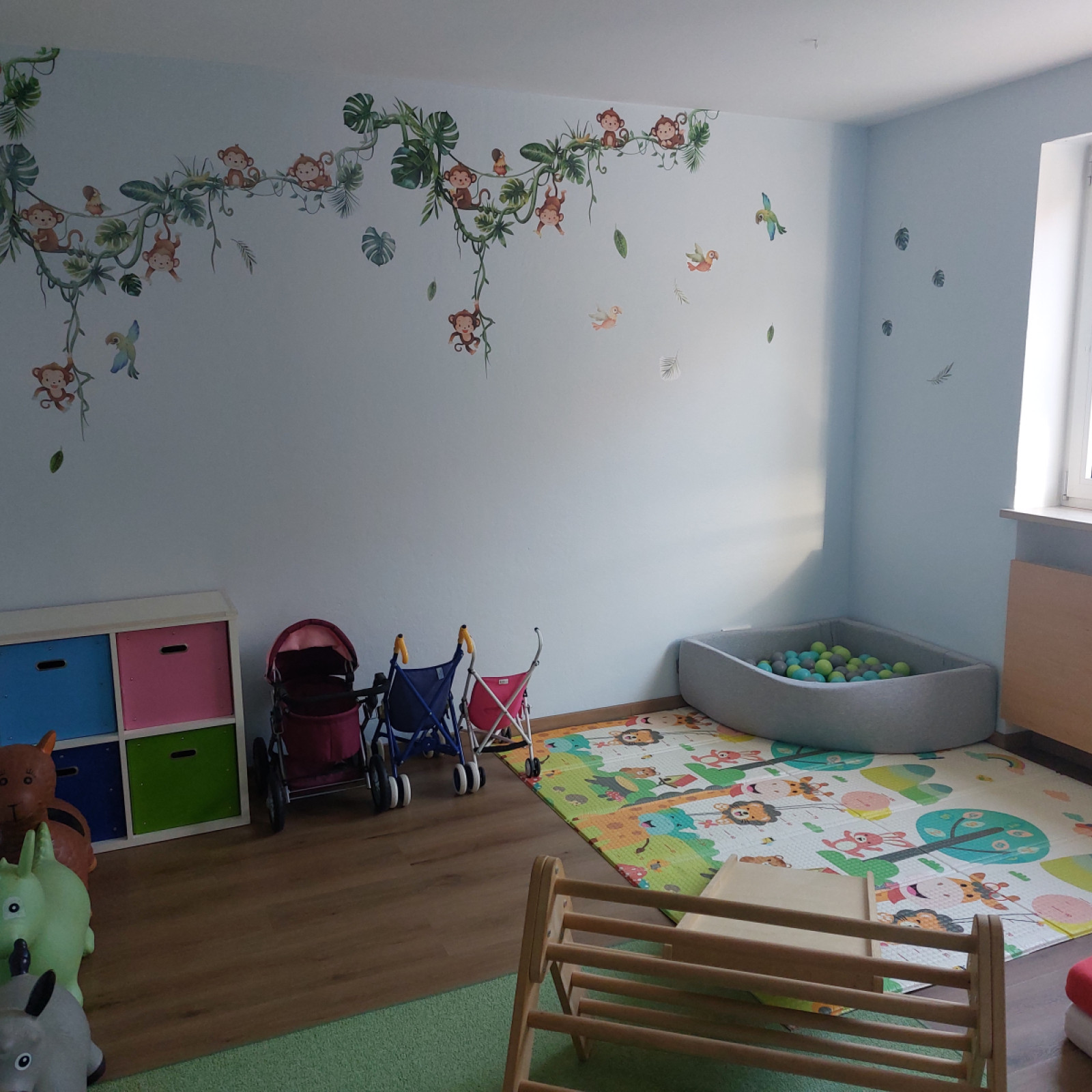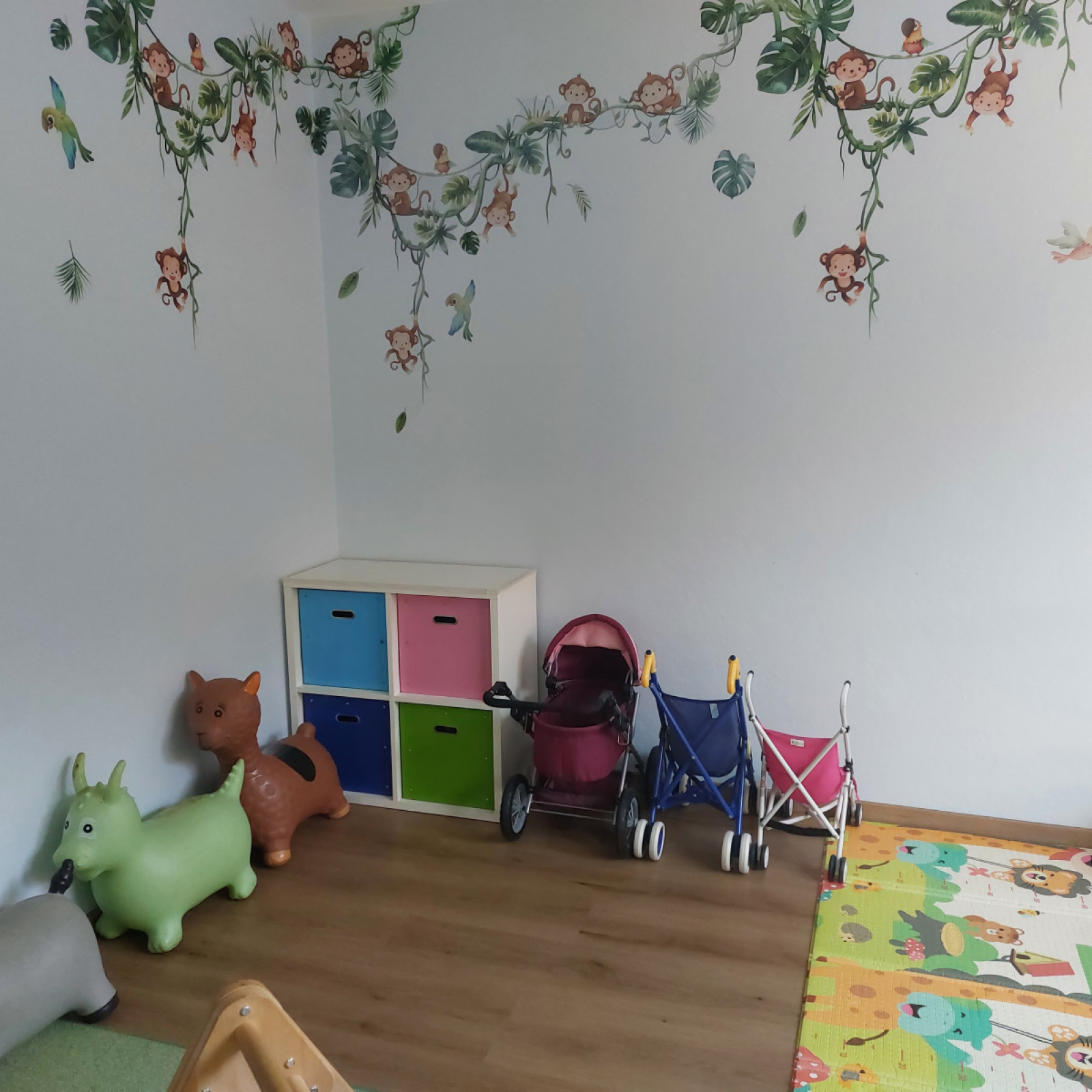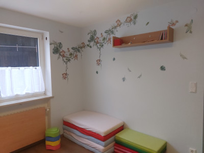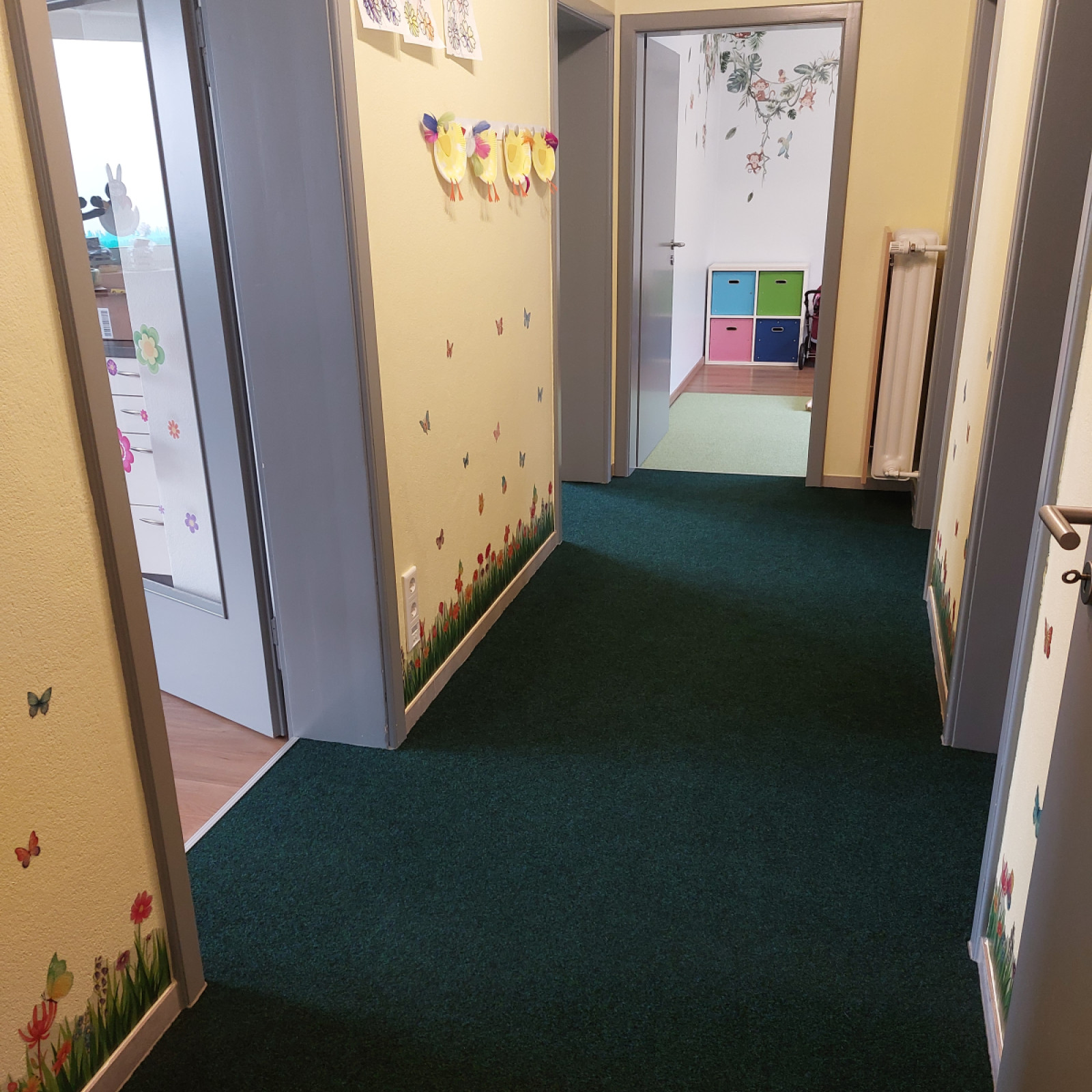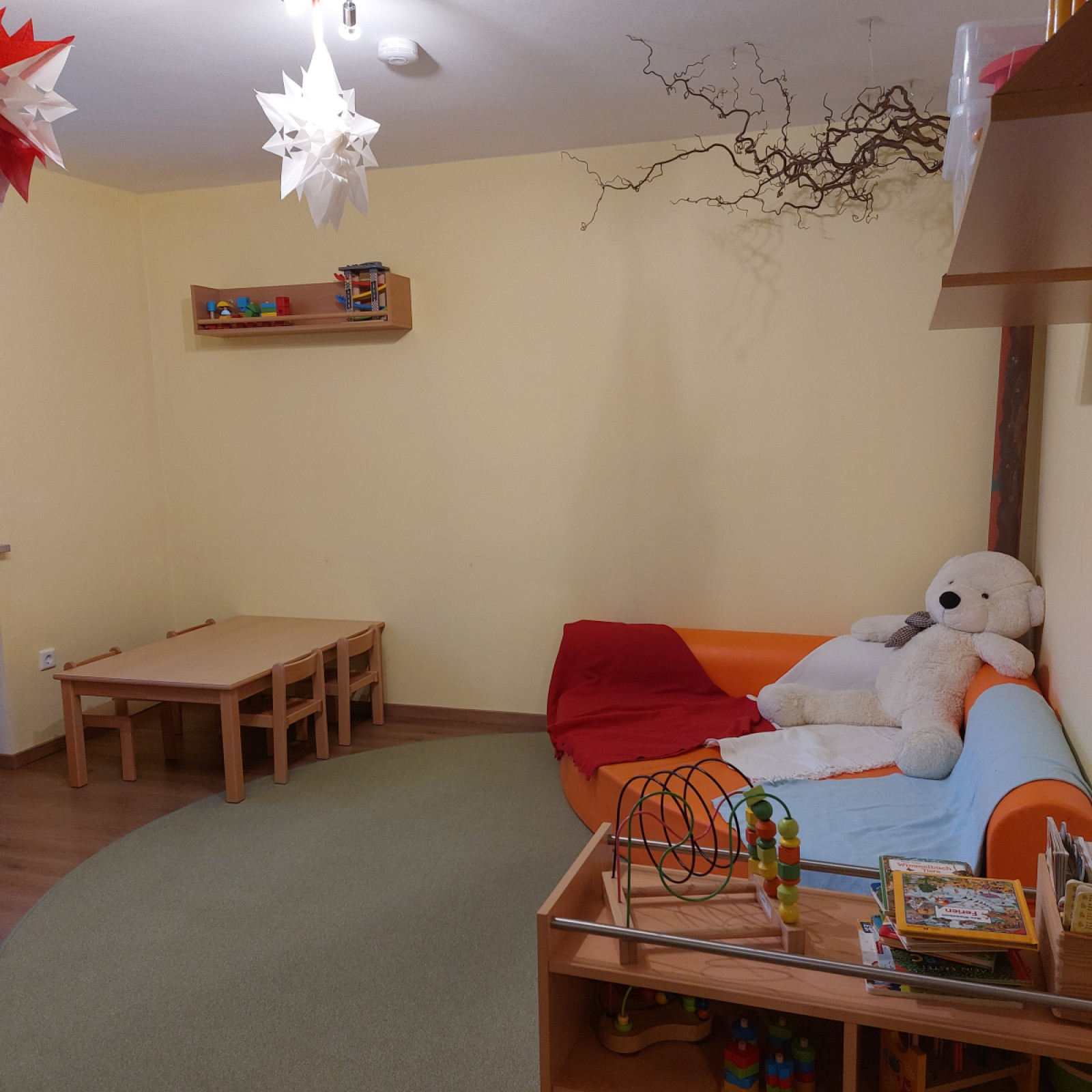 Im Eingangsbereich gibt es Platz für Wechselkleidung, Gartenkleidung und für persönliche Dinge. Der Flur ist groß, an ihn grenzen alle anderen Räume an. Unser Hauptraum lädt zum kuscheln, lesen und spielen ein. Im Toberaum kann geklettert und gerutscht werden, auch kann man dort hervorragend Höhlen bauen.